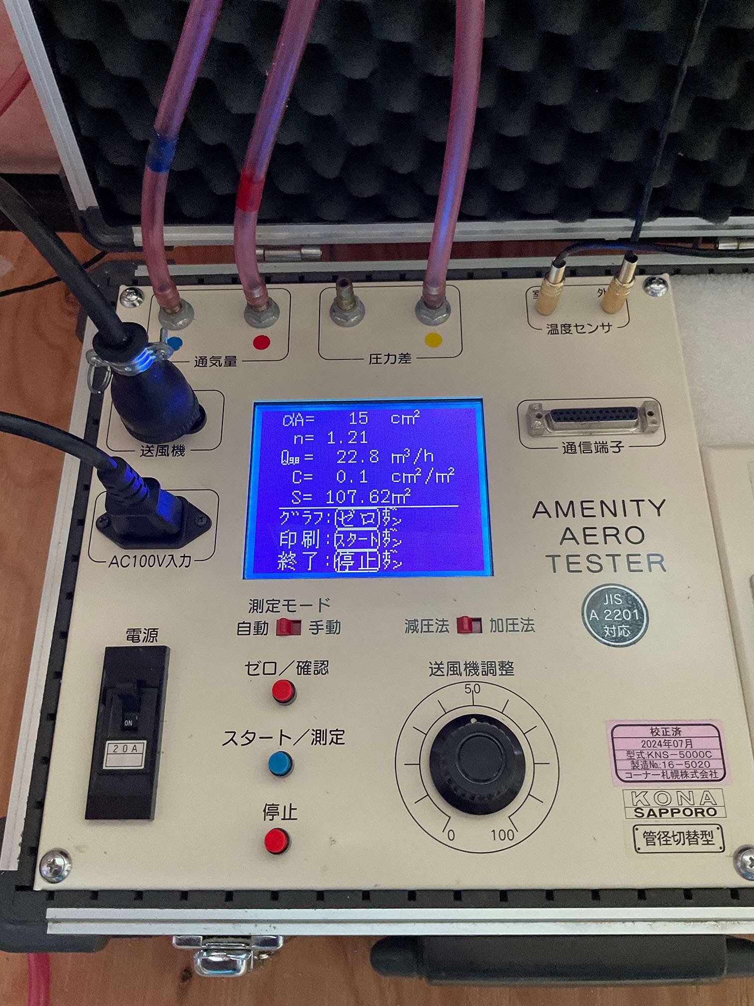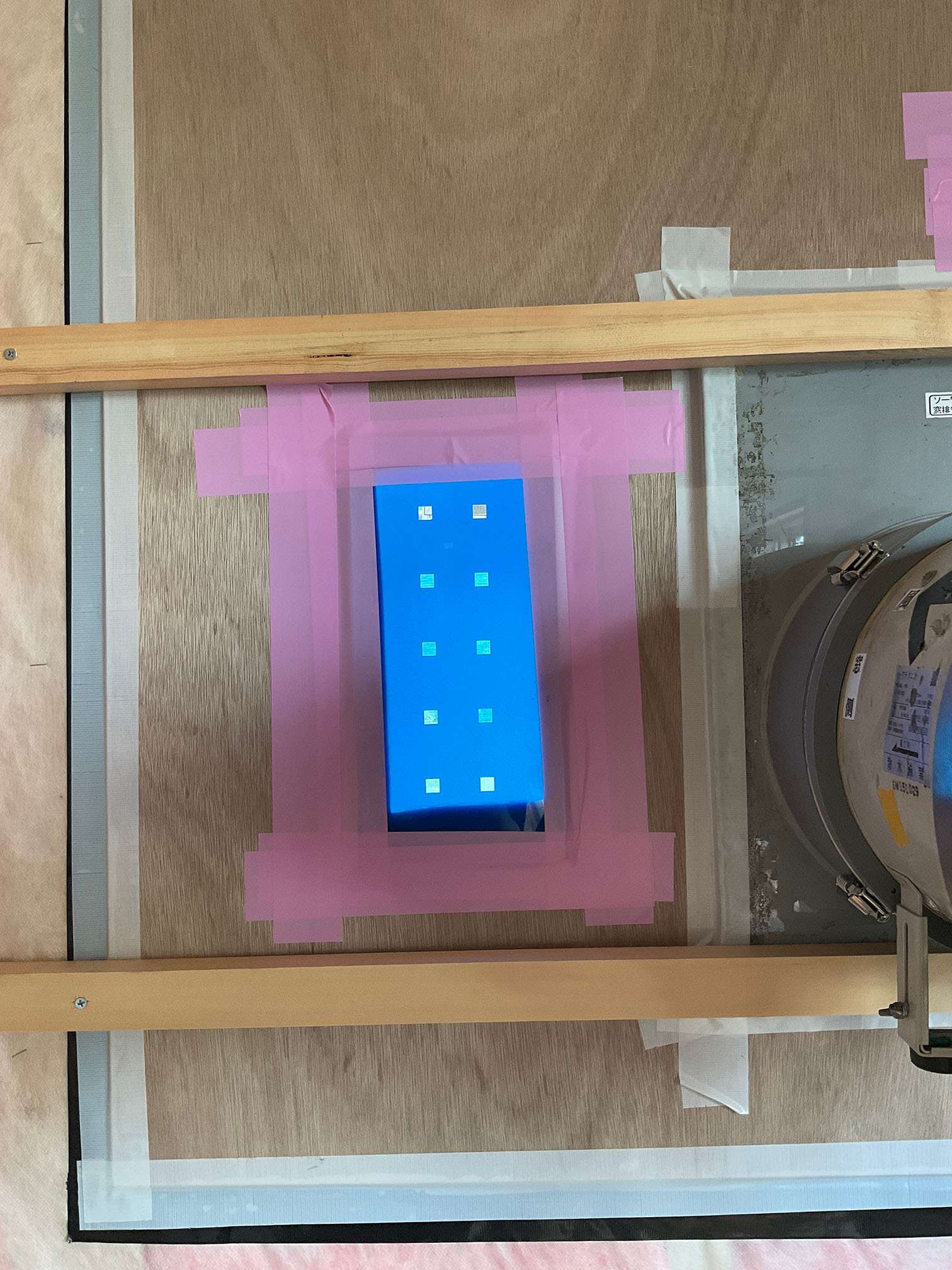 そのため、わざと穴をあけて、気密測定器の測定範囲の下限である10cm2を超えた隙間を用意して、気密性能を確認する場合があります。
