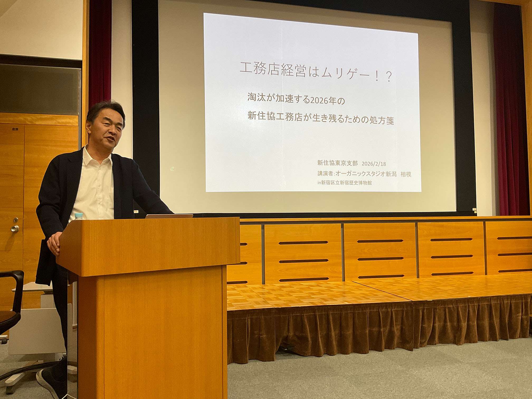 今回のテーマは「工務店経営」についてのセミナーで、業界内でも有名人であるオーガニックスタジオ新潟の相模社長による講演です。