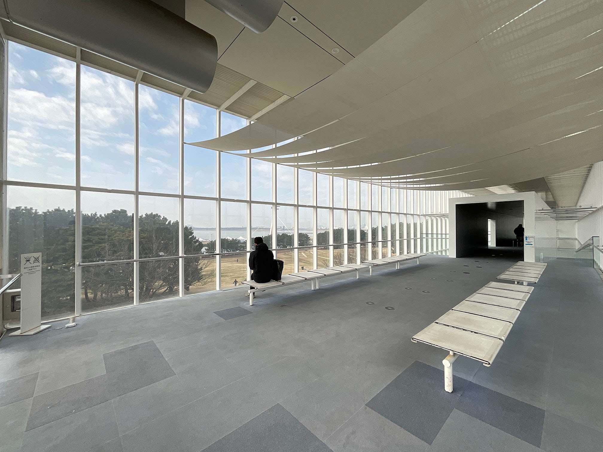 展望エリアでは、ベンチに腰掛けた際に天井高が高すぎて落ち着かない印象を与えないようになのか、天井に白い幕がかかっており、意図的に天井を低く抑える設計となっていました。