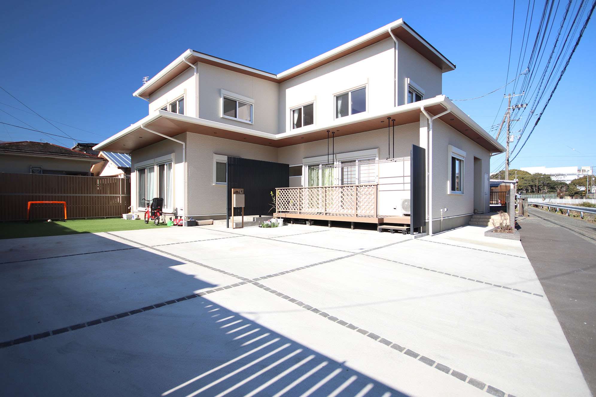 100坪を超える大きな敷地だったが、自動車3台を並列駐車したいとのご要望だったため、慎重に配置計画を考えて、家の外観を先に決定した。