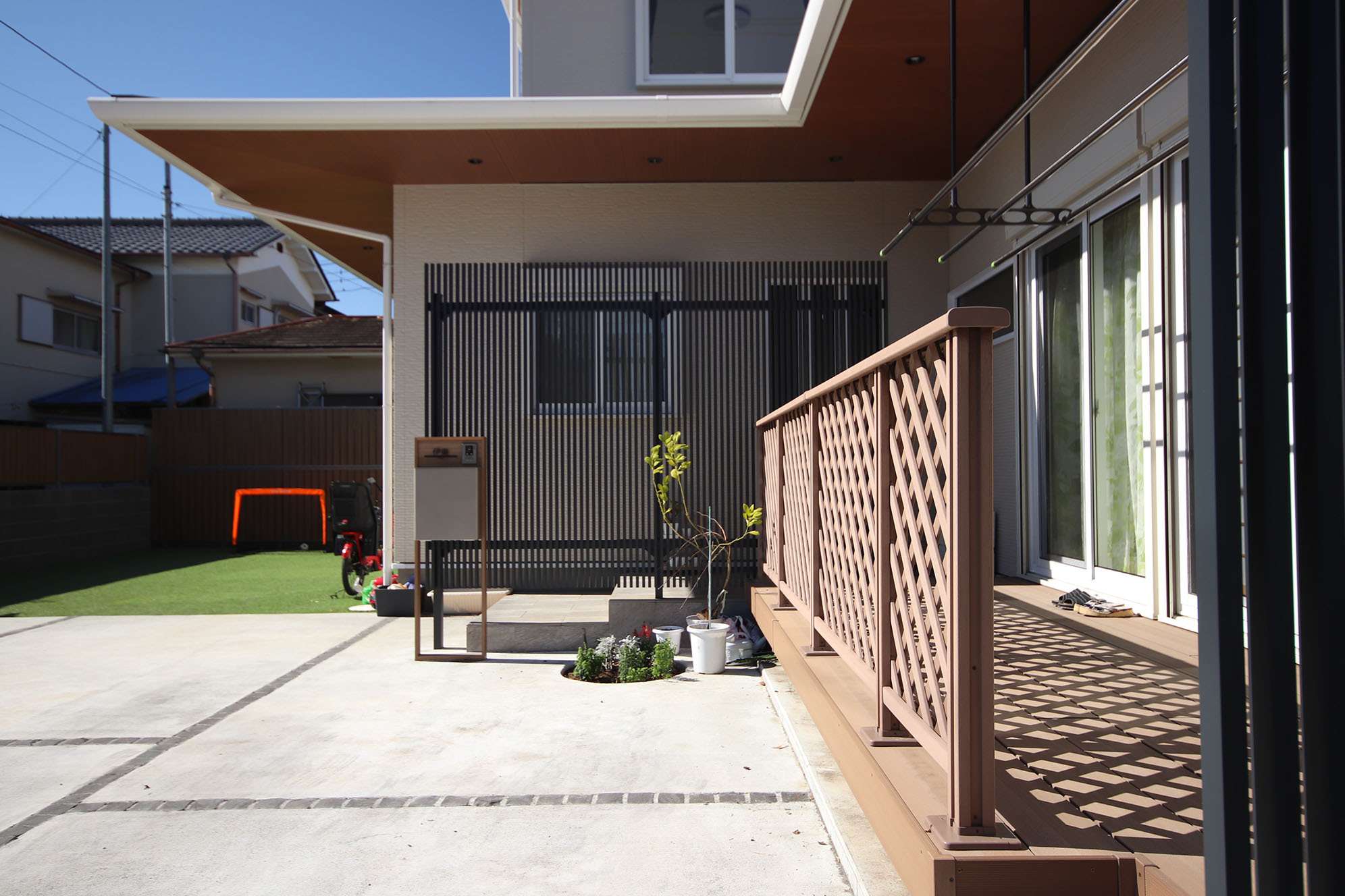 大きく軒を出した下屋によって、雨の日に濡れないだけでなく、日射熱をうまく遮ってくれて、夏の晴れた日でも快適な環境を維持できるように工夫した。